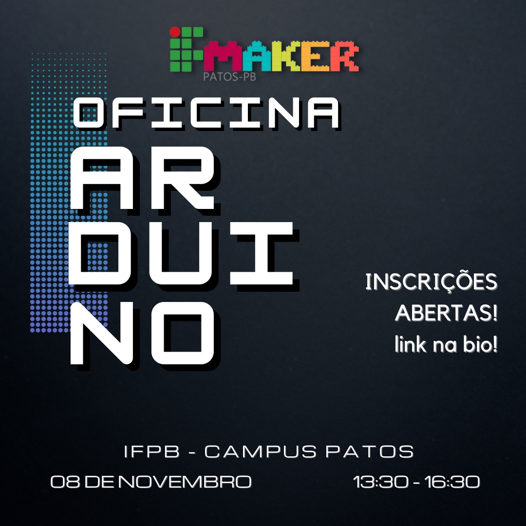 O Laboratório do IF Maker do Instituto Federal da Paraíba, Campus Patos promove Oficina gratuita de Arduíno. No dia 08 de novembro de 2022, a partir da 13:30 até 16:30.