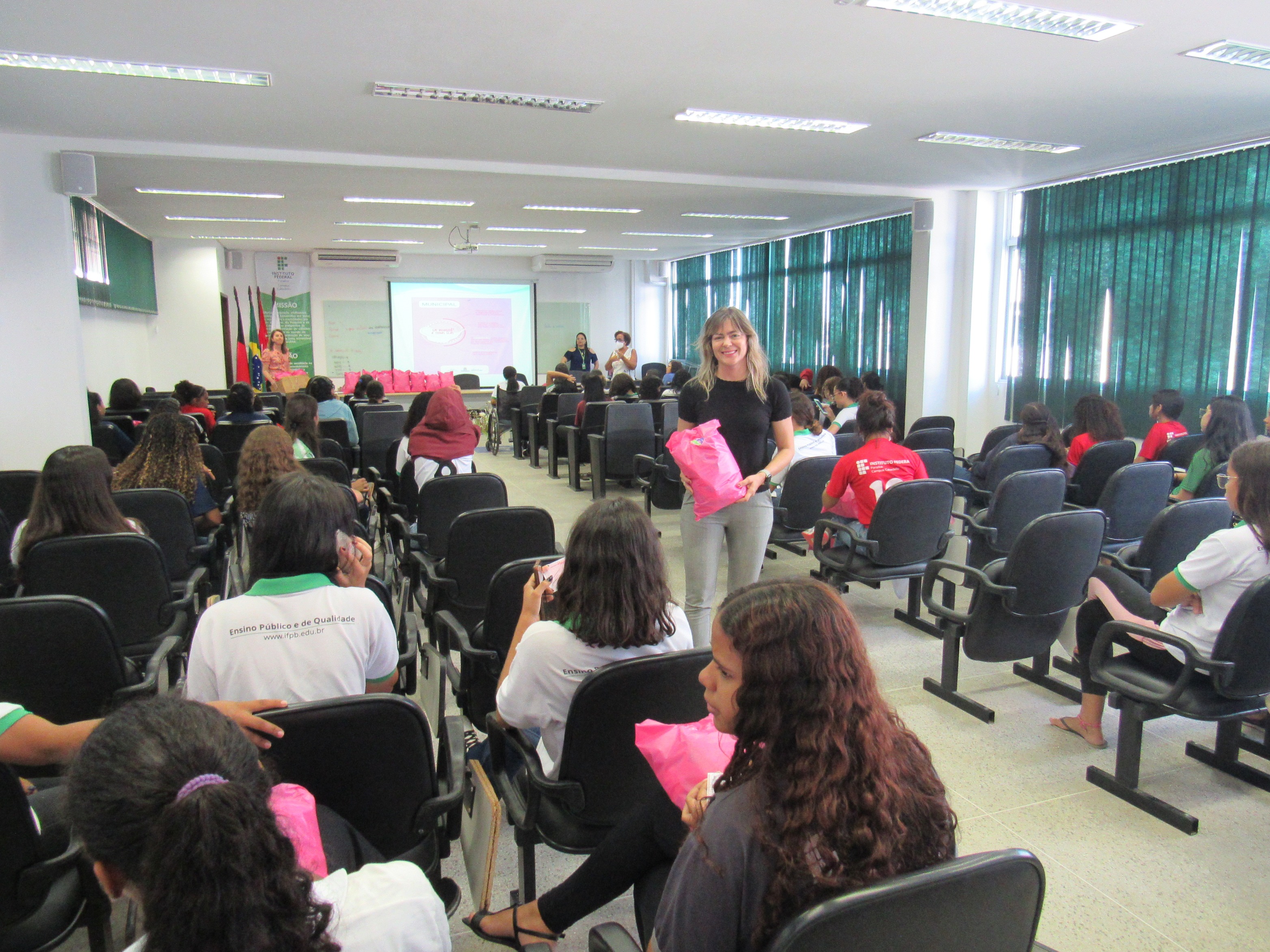 Estudantes recebem kits com absorventes higiênicos e assistem a palestras sobre higiene menstrual e métodos contraceptivos.
