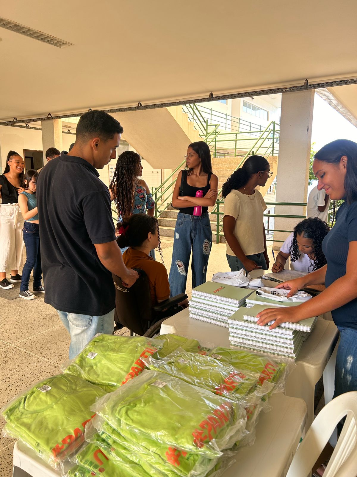 Acompanhados de familiares, adolescentes de 13 a 15 anos, estudantes do 9º ano do ensino fundamental, recebem material escolar e participam da aula inaugural do Programa