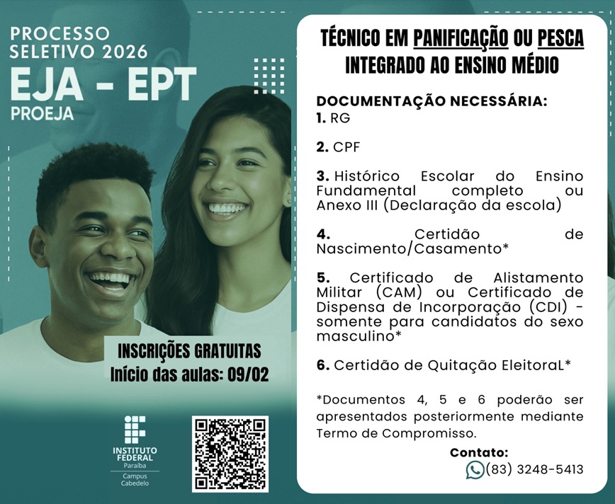 Com mais de 4 mil vagas, o IFPB encerra nesta segunda( 06) as inscrições do Processo Seletivo 2026. Todos os cursos são gratuitos e sem taxa de inscrição