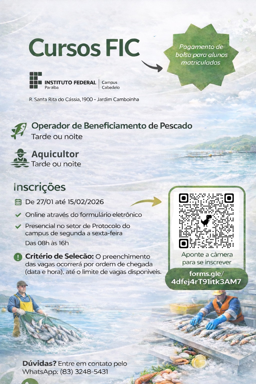 As inscrições para os cursos Aquicultor e Operador de Beneficiamento de Pescado estão abertas até 15/02/2026