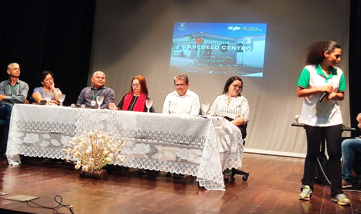 A Reitoria Itinerante do IFPB, presidida pela reitora Mary Roberta, promoveu uma série de reuniões com a comunidade do Campus Cabedelo Centro no dia 13 agosto, no Teatro Santa Catarina. Às 8h30, a equipe de dirigentes se encontrou com os estudantes, e às 14h, a reunião foi com os servidores. Em seguida foram realizadas avaliações com a gestão do campus e uma reunião sobre planejamento estratégico.
