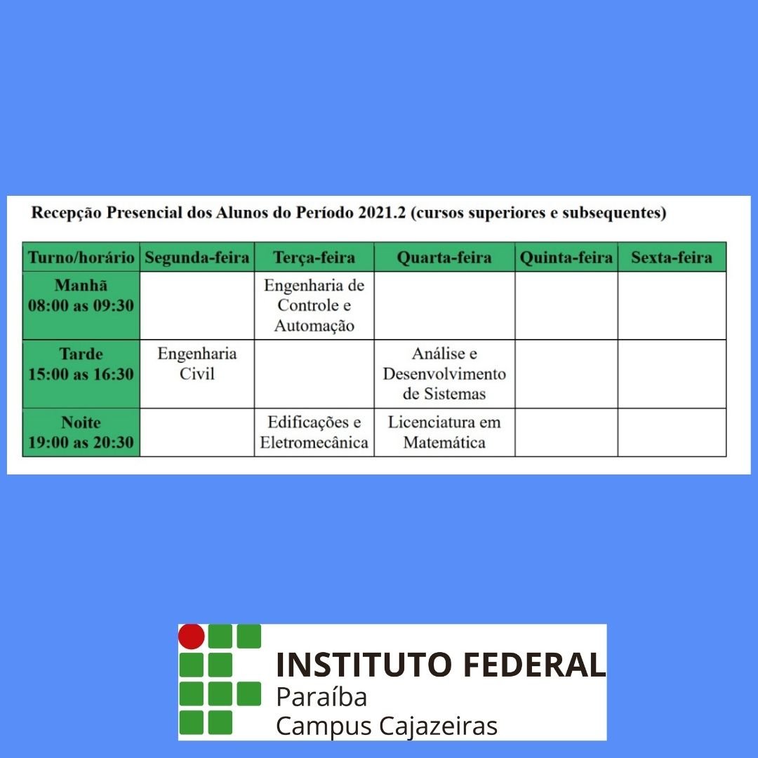 Os estudantes serão recepcionados no auditório do Campus Cajazeiras, entre a segunda (18) e quarta-feira (20), em horários diferentes, de acordo com cada curso e respeitando os protocolos de segurança.