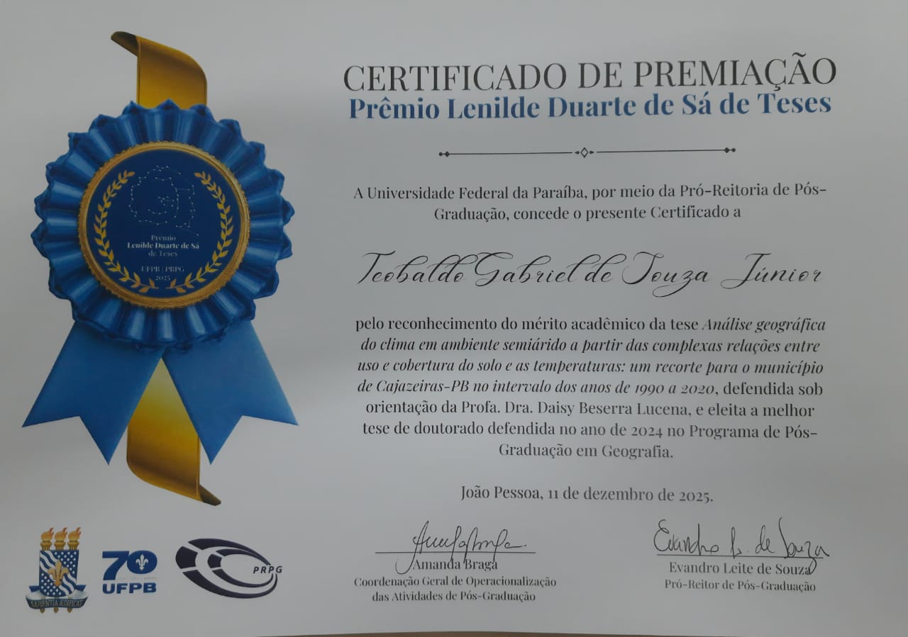 A tese, intitulada “Análise Geográfica do Clima em Ambiente Semiárido a partir das Complexas Relações entre Uso e Cobertura do Solo e as Temperaturas: Um Recorte para o Município de Cajazeiras-PB no Intervalo dos Anos de 1990 a 2020”, representa um trabalho inovador e uma contribuição significativa para as Ciências da Terra. O estudo se destaca pelo rigor metodológico e pelo impacto científico, sobretudo no contexto desafiador do semiárido.