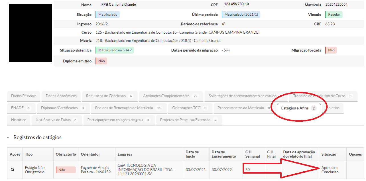 Do ponto de vista administrativo, seu estágio possui diversos status (ou situações) ao longo do seu ciclo de vida junto ao SUAP. Para que o aluno solicite a conclusão do mesmo, este estágio deverá estar com o status "apto para conclusão". O aluno poderá analisar esse status através da aba "estagios e afins" junto ao SUAP. Vide imagem abaixo e analise as áreas com a elipse e a seta vermelha: