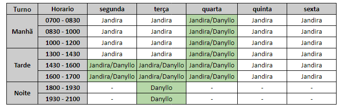 De forma resumida, o horário da prestadora Jandira Brito segue o horário de funcionamento diurno. O professor Danyllo possui carga horária reduzida em virtude das suas funções como docente e pesquisador deste Campus. Finalmente, visando uma melhor prestação dos serviços desta coordenação a toda comunidade acadêmica do nosso instituto, o professor Danyllo deverá preencher 6 horas de atividades semanais nos horários descritos no quadro acima.