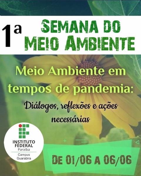 O Campus Guarabira do IFPB deu início nesta segunda-feira (01) a I Semana do Meio Ambiente. Devido a pandemia da Covid-19 a programação ocorre de forma virtual até o próximo sábado (06) dentro das atividades da Semana Mundial do Meio Ambiente.