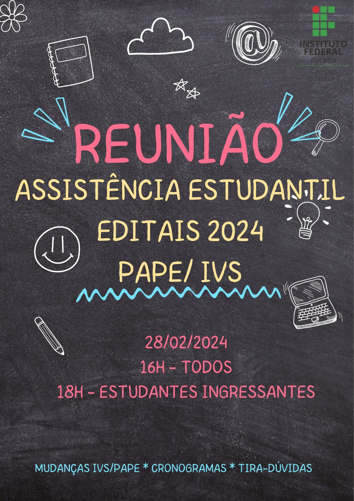 Campus Guarabira fará uma reunião com os estudantes para explicar o funcionamento dos editais PAPE e IVS de 2024, como formas de acesso aos auxílios estudantis.