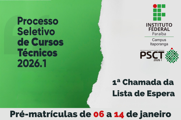 Campus Itaporanga convoca os candidatos pré-classificados por meio da Lista de Espera do Processo Seletivo de Cursos Técnicos - PSCT 2026 para manifestação de interesse em matrícula através das vagas remanescentes nos Cursos Técnicos Integrados ao Ensino Médio. Os convocados deverão realizar a pré-matrícula de forma remota (online), no período entre 06 e 14 de janeiro de 2026, através do Portal do Estudante.