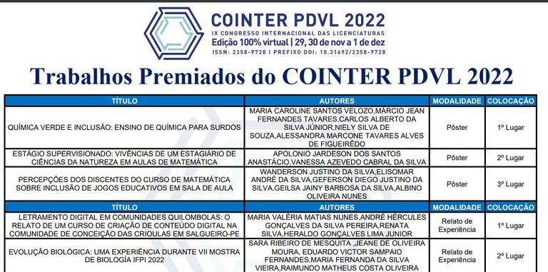 ”, aprovada na Chamada Interconecta 2022 e desenvolvida por docentes e discentes do IFPB nos campi João Pessoa, Sousa e Cabedelo, vem ganhando reconhecimento nacional e internacional. O trabalho foi premiado em 1º lugar, na modalidade pôster, durante o IX Congresso Internacional das Licenciaturas, realizado de forma virtual nos dias 29, 30 de novembro e 1º de dezembro de 2022.A equipe de pesquisadores foi composta pelos professores Alessandra Marcone Tavares Alves de Figueiredo, Niely Silva de Souza e Carlos Alberto da Silva Júnior e pelos discentes Júlia Maria Soares Ferraz, Maria Caroline Santos Velozo e Márcio Jean Fernandes Tavares. Para a professora Alessandra Marcone Tavares Alves de Figueiredo, “a premiação enaltece, reforça e amplia pesquisas na área da inclusão e da Química Verde, contribuindo significativamente para a divulgação dos grupos de estudos no âmbito acadêmico nacional e internacional”, destacou a professora.