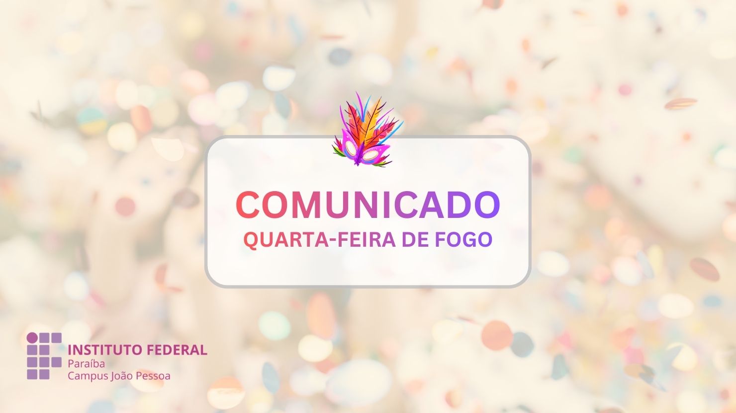 A Direção Geral do Instituto Federal da Paraíba – Campus João Pessoa informa que, nesta quarta-feira (11/02), o horário de expediente administrativo e das atividades acadêmicas será encerrado às 15h30. Na quinta-feira (12/02), o expediente e as aulas voltam ao horário normal.