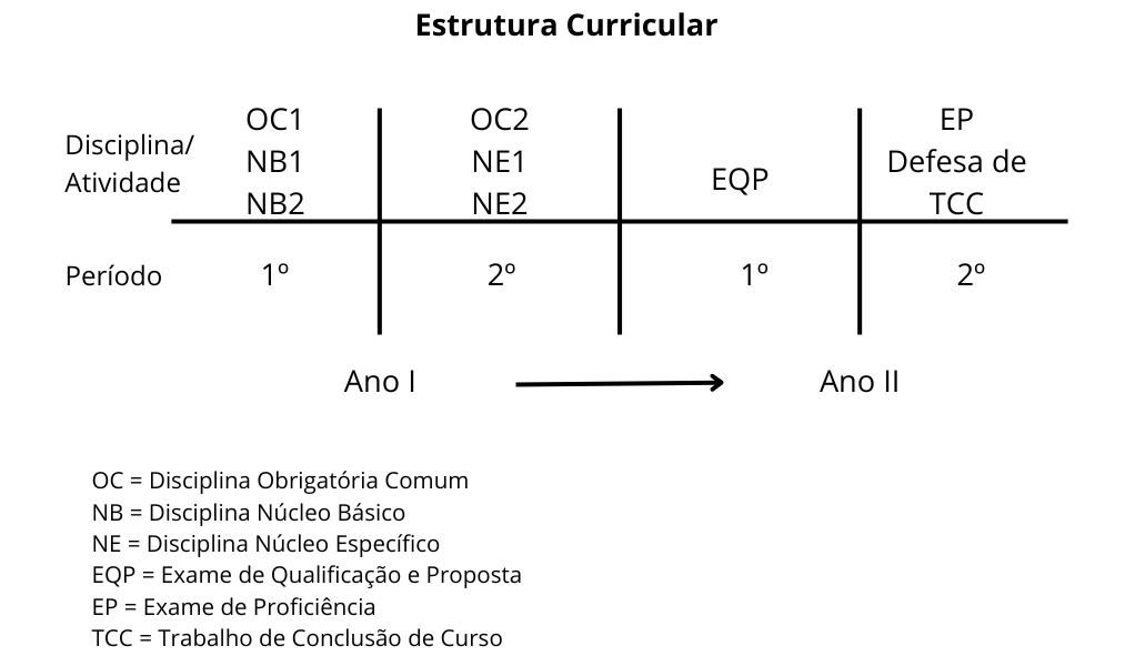 O currículo do Mestrado requer um mínimo de 24 créditos obtidos através da realização de disciplinas agrupadas em três categorias (Obrigatórias, Núcleo Básico de Formação, e Núcleo Específico de Formação), conforme descrição seguinte: