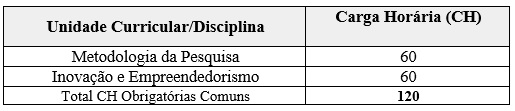 1) Disciplinas obrigatórias de formação básica comum às três linhas de pesquisa (8 créditos obrigatórios): são disciplinas de núcleo comum que tratam de aspectos referentes a conhecimentos básicos e aplicados ao processo de pesquisa, desenvolvimento, inovação e empreendedorismo, vertentes fundamentais esperadas na qualificação por meio do mestrado profissional. São mostradas no Quadro 1.