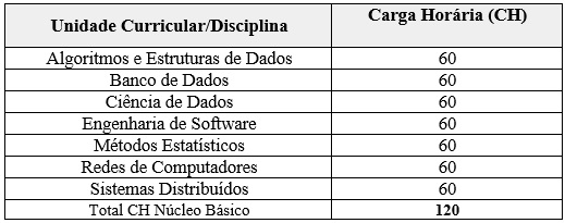 2) Disciplinas de núcleo básico de formação (8 créditos a serem escolhidos/cumpridos): referem-se às disciplinas que tratam de aspectos referentes a conhecimentos básicos em Computação com opções organizadas conforme necessidades a serem trilhadas pelo estudante com respeito à sua trajetória e linha de pesquisa. São sete opções de disciplinas nesta etapa (Quadro 2), onde o discente irá escolher/cumprir, pelo menos, duas delas, escolhas que devem ser alinhadas com o orientador da pesquisa: