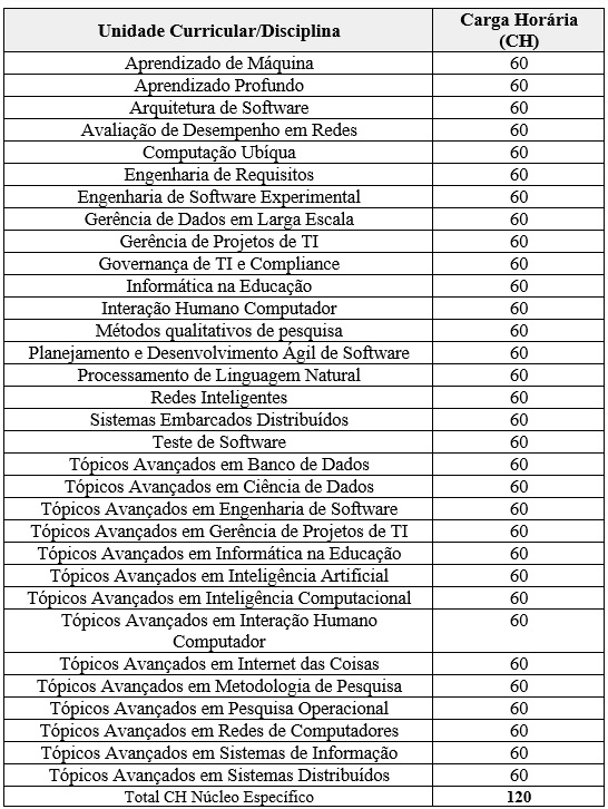 3) Disciplinas de núcleo específico de formação(8 créditos a serem cumpridos/escolhidos): são disciplinas a serem escolhidas conforme a trajetória e linha de pesquisa do discente, conforme alinhamento com o professor orientador. A lista de disciplinas deste núcleo é apresentada no Quadro 3.