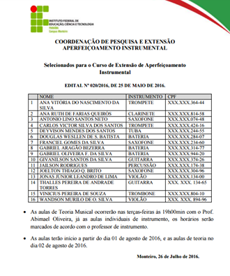 O Instituto Federal da Paraíba, campus Monteiro, disponibiliza o resultado final da seleção do aluno inscritos no curso de Aperfeiçoamento Instrumental vinculado ao Projeto de Extensão de Aperfeiçoamento Instrumental.