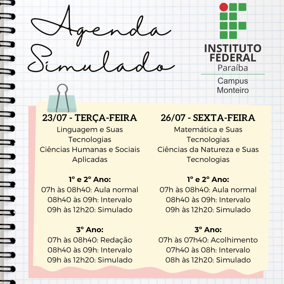 O IFPB campus Monteiro promoverá, nos dias 23 e 27 de julho, O 1º Simulado Preparatório para o Enem, destinados aos alunos dos Cursos Integrados ao Ensino Médio do campus. Além do propósito preparatório, o simulado servirá como a segunda nota do bimestre.