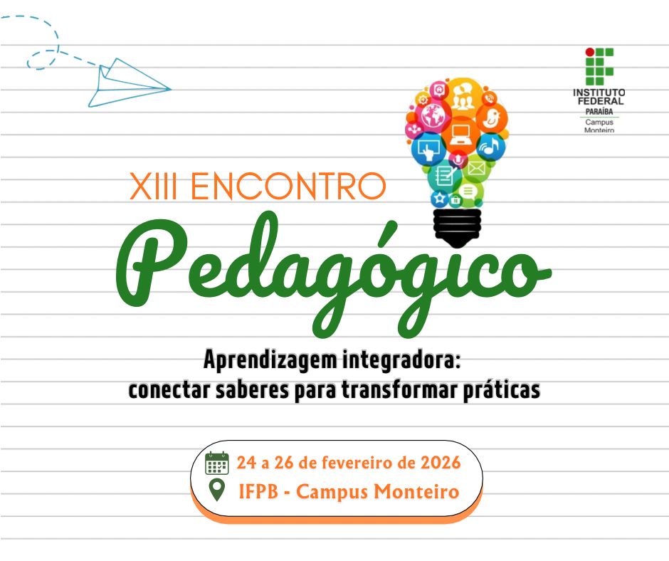 O Instituto Federal da Paraíba campus Monteiro realizará, no período de 24 a 26 de fevereiro, o Encontro Pedagógico de 2026, com a temática "Aprendizagem Integradora: conectar saberes para transformar práticas". O encontro será um momento de formação, reflexão e planejamento coletivo fundamental para o fortalecimento das práticas pedagógicas em nossa instituição.