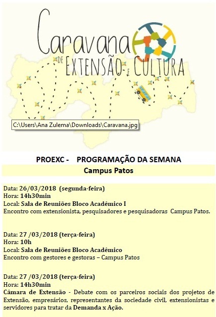 A equipe técnica da Pró-Reitoria de Extensão e Cultura (Proexc/IFPB) visita no dia 26 corrente o Campus Patos. Nesta segunda semana, a Caravana da Extensão, da Proexc, pretende fazer reuniões com extensionistas dos Campi de Patos, Itaporanga (28/03). Os eventos contam com a participação de estudantes e servidores, com atuação na extensão, além dos gestores dos referidos Campi.