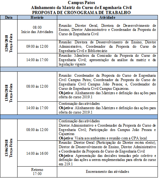 A proposta do Instituto Federal da Paraíba é ofertar em 2019.1 o curso de Bacharelado em Engenharia Civil nos Campi de João Pessoa e Patos, visto que em Cajazeiras já existe de 2014.