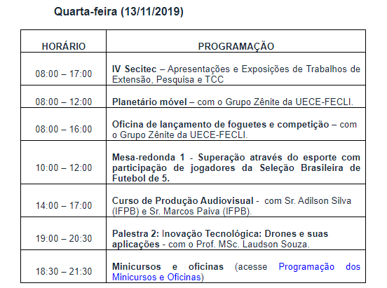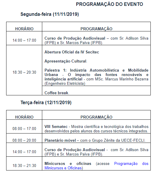 A Semana de Ciência e Tecnologia do IFPB Campus Patos - SECITEC é um evento de divulgação científica composto por palestras, mostras tecnológicas e oficinas.