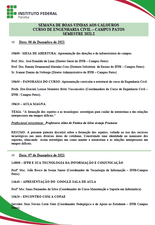 O Instituto Federal da Paraíba, Campus Patos, através da Coordenação do Curso de Engenharia Civil promove aula magna para os alunos de Engenharia Civil 2021.2, no dia 06 de dezembro de 2021, com o