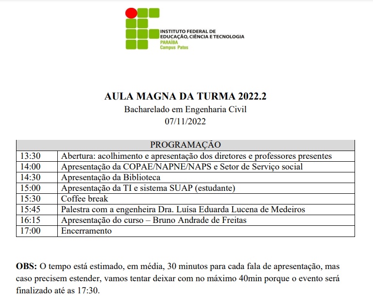 Campus Patos promove aula magna para alunos de Engenharia Civil 2022.2
