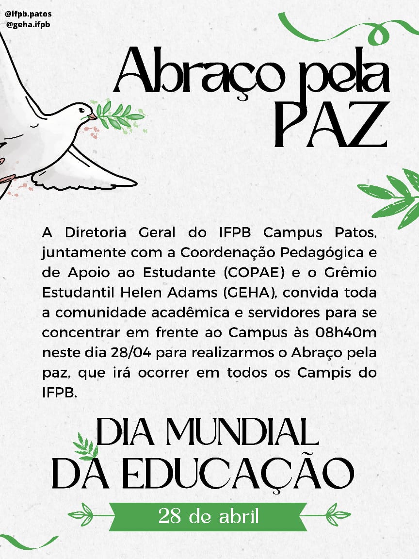 Dia 28 de abril, no dia Mundial da Educação Campus Patos convida educadores e alunos para uma abraço pela Paz.