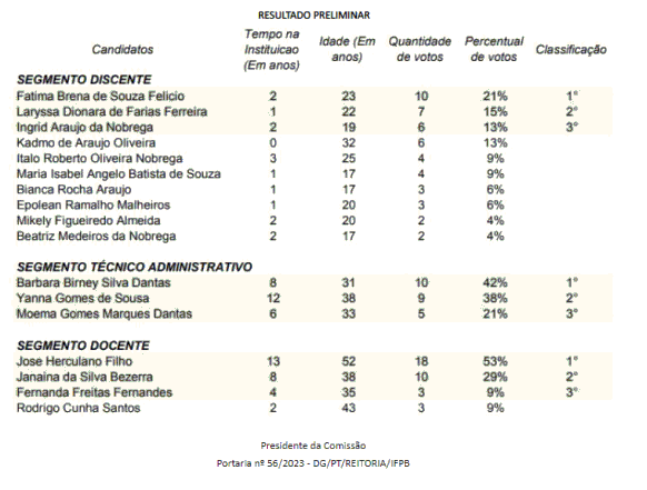 A Comissão instituída no Instituto Federal da Paraíba, Campus Patos, por meio da Portaria nº 56/2023- DG/PT/REITORIA/IFPB, de 20 de março de 2023, torna pública a lista preliminar dos membros eleitos para compor a equipe, pelo Biênio 2023/2024, do Núcleo de Combate ao Assédio (NUCA), nos segmentos docente, técnico administrativo e discente, nos termos estabelecidos pela Resolução CONSUPER nº 60, de 16 de julho de 2021, conforme abaixo: