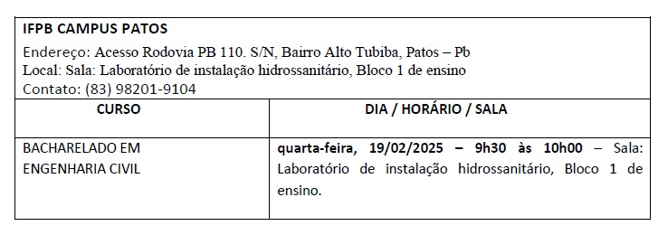 O Instituto Federal de Educação, Ciência e Tecnologia da Paraíba – IFPB, Campus Patos, através da Diretoria de Desenvolvimento de Ensino e de acordo com as disposições da legislação em vigor, convoca, por meio do Edital DDE nº 11/2025, os candidatos às vagas reservadas para negros (pretos e pardos) e indígenas autodeclarados no ato da inscrição e na pré-matrícula de ingresso nos cursos superiores ofertados pelo IFPB através do Processo Seletivo SISU 2025, para o procedimento de verificação de veracidade da autodeclaração, conforme o Edital abaixo: