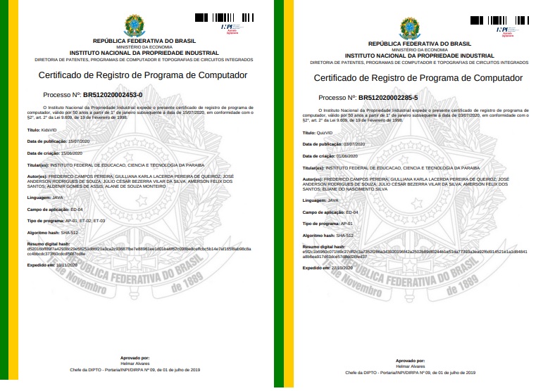 Estudantes e professores do IFPB campus Pedras de Fogo fizeram do isolamento social uma boa oportunidade de levar informações mediante o desenvolvimento de aplicativos (mobile) acerca do Coronavírus e as práticas preventivas à Covid-19 para a comunidade em geral. A partir de esclarecimentos de dúvidas por meio da parceria social com a Secretaria de Saúde da Prefeitura de Pedras de Fogo, foram criados aplicativos (software) na plataforma App MIT Inventor com a denominação de QuizVID e KidsVID. Os aplicativos receberam o registro do INPI - Instituto Nacional da Propriedade Industrial (Imagem abaixo).