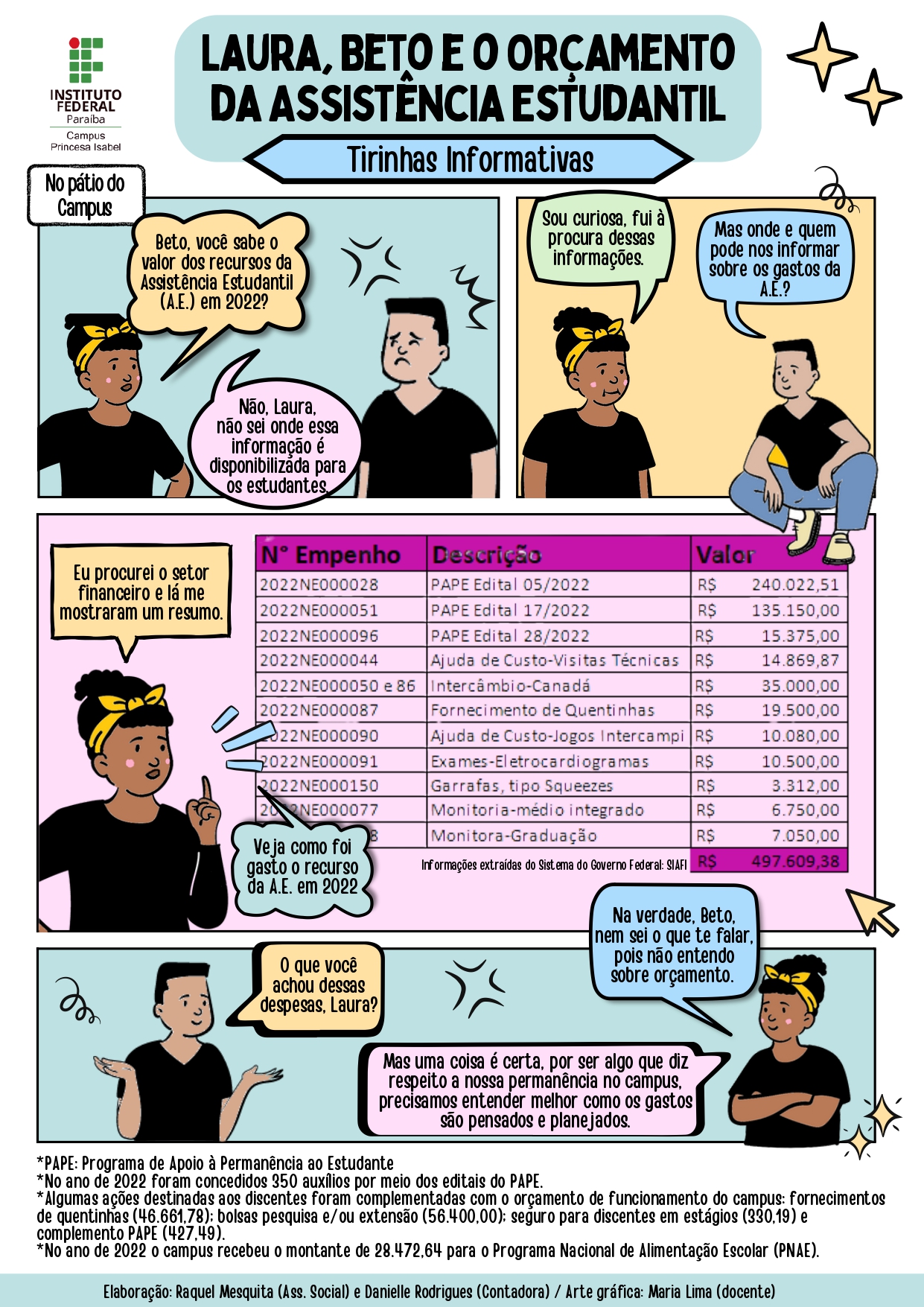 Tirinhas informativas sobre o orçamento da Assistência Estudantil do IFPB Campus Princesa Isabel