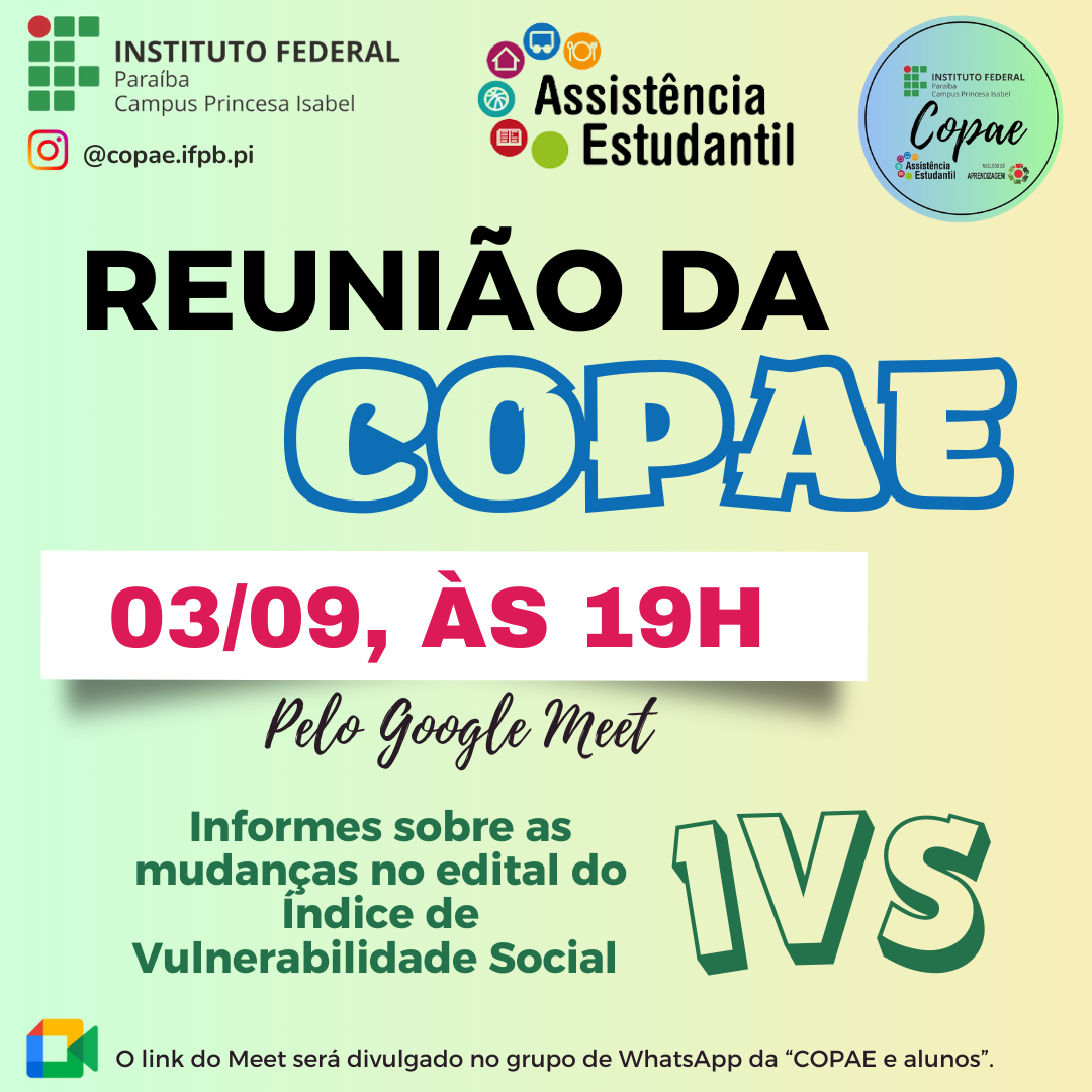 ⚠️ Amanhã, dia 03/09, terça-feira, às 19h, a COPAE realizará uma reunião pelo Meet para passar informações sobre as mudanças no Edital nº 11/2024 do Índice de Vulnerabilidade Social (IVS) e esclarecer as eventuais dúvidas com a Assistente Social da COPAE.
