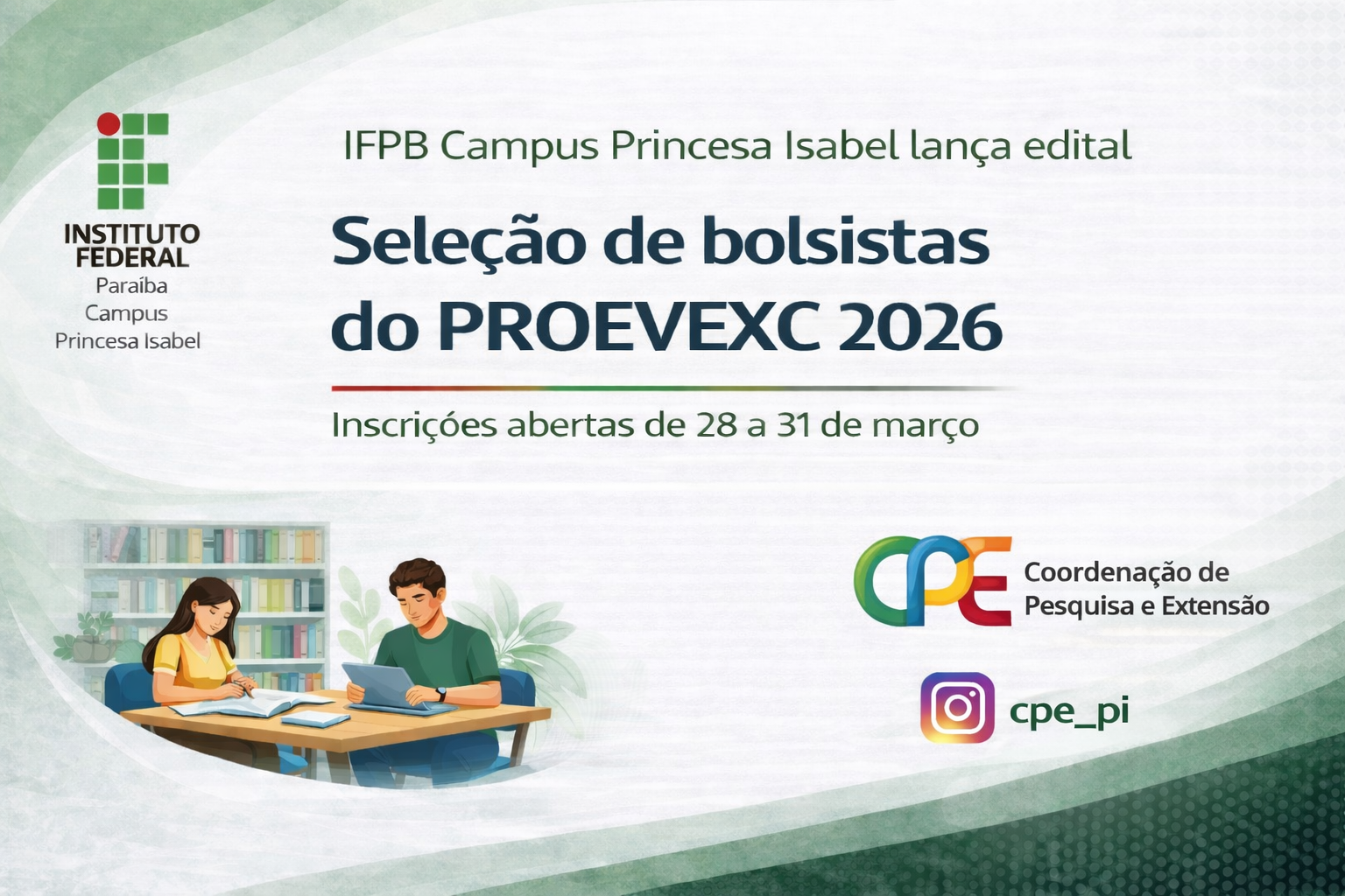 A Coordenação de Pesquisa e Extensão (CPE) do IFPB – Campus Princesa Isabel torna pública a abertura do processo seletivo para estudantes interessados em atuar como bolsistas em projetos de extensão e cultura vinculados ao PROEVEXC 2026 do próprio campus.