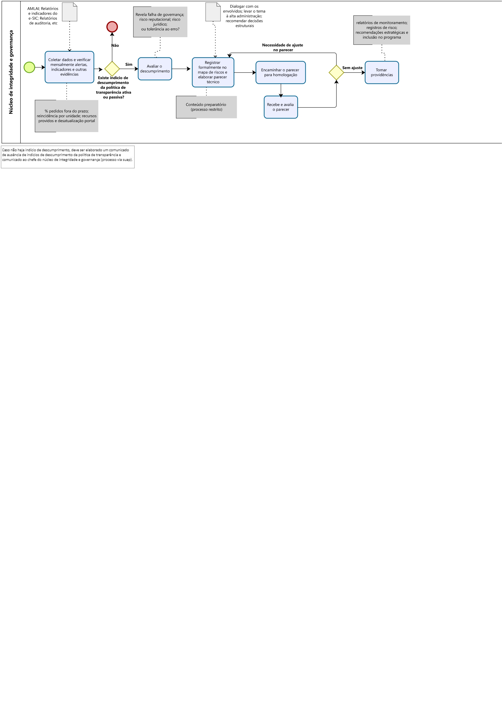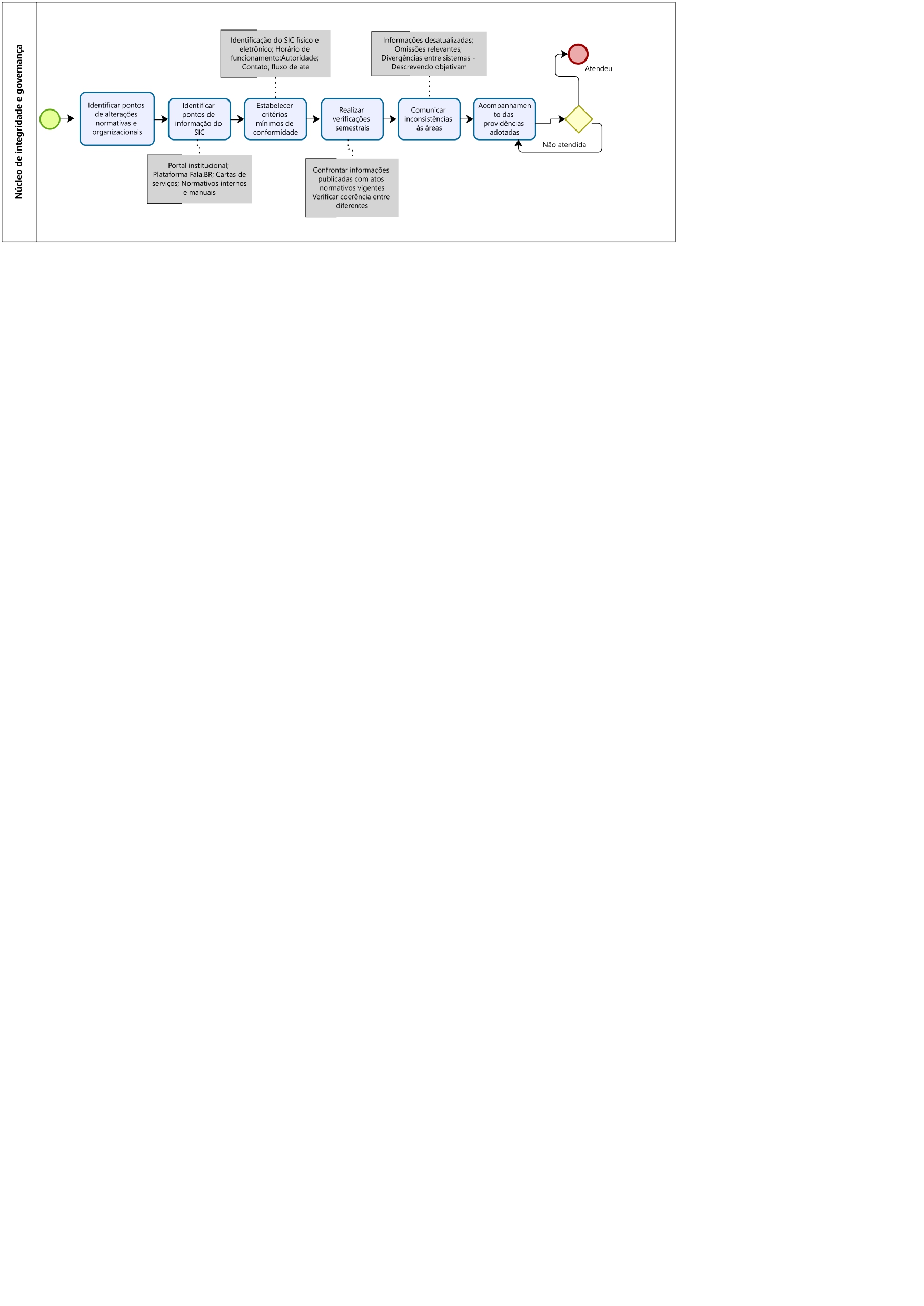 Conheça os processos do Núcleo de Integridade e Governança (Supervisão e Monitoramento da Política de Transparência e Acesso à Informação; Manter atualizadas as informações sobre os serviços de informação ao cidadão; Elaborar plano de integridade; Atualizar o inventário de base de dados e a catalogação dos dados abertos no Portal Brasileiro de Dados Abertos).