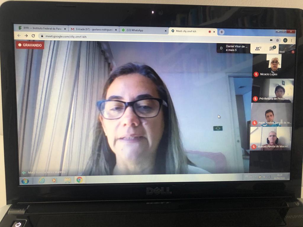 A Pró-Reitora de Ensino, professora Mary Roberta Meira Marinho, fez uma exposição das ações em andamento e dos projetos que estão sendo preparados pelos campi relativos ao combate à pandemia e sobre os recursos financeiros que serão disponibilizados pelo MEC, através da Setec, para combate ao Coronavírus no âmbito da Rede Federal de Educação.
