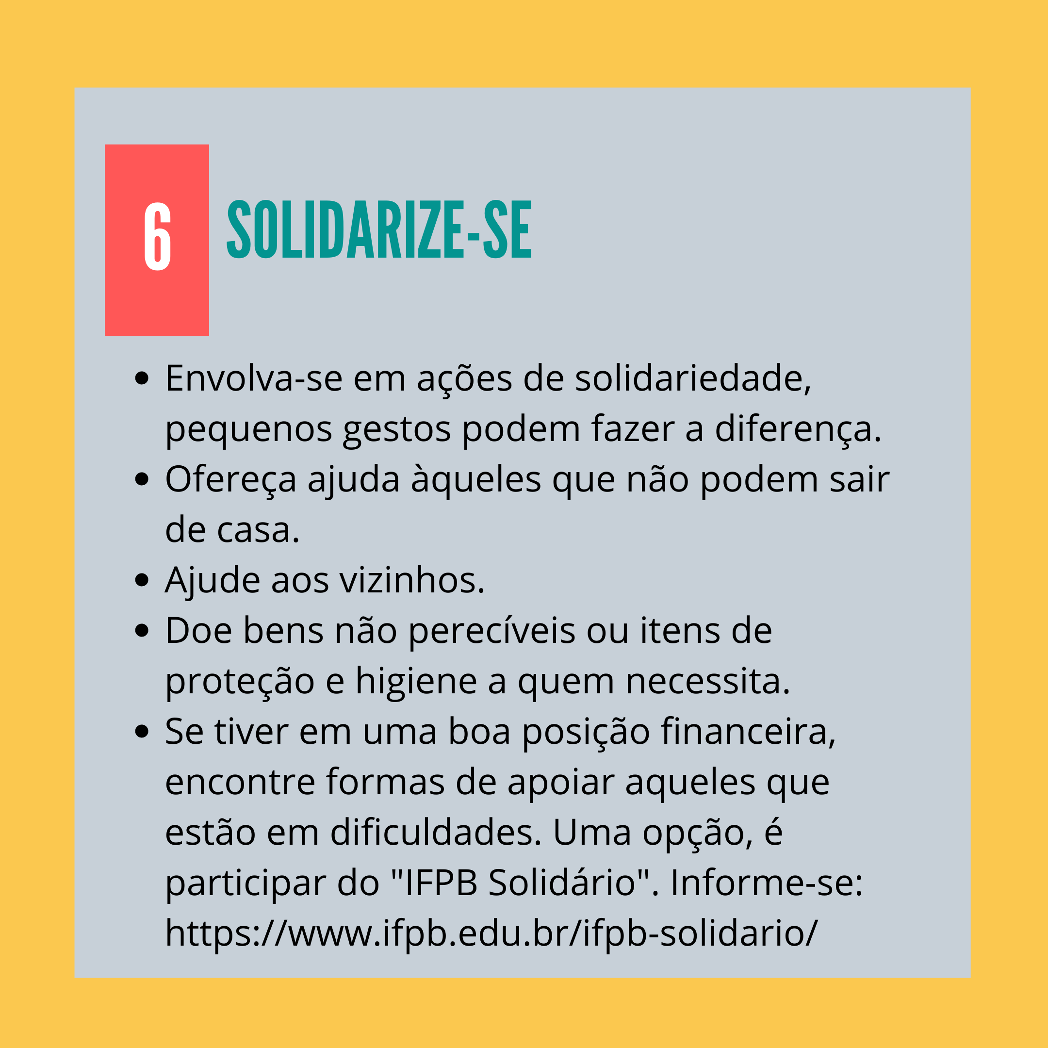 Confira as dicas no boletim “Se Liga”. Caso você se sinta motivado em ajudar ao próximo, solidarize-se. Encontre formas de apoiar aqueles que estão numa situação de vulnerabilidade. O IFPB está arrecadando fundos para doação por meio da campanha IFPB Solidário. Acesse www.ifpb.edu.br/ifpb-solidario e saiba mais.