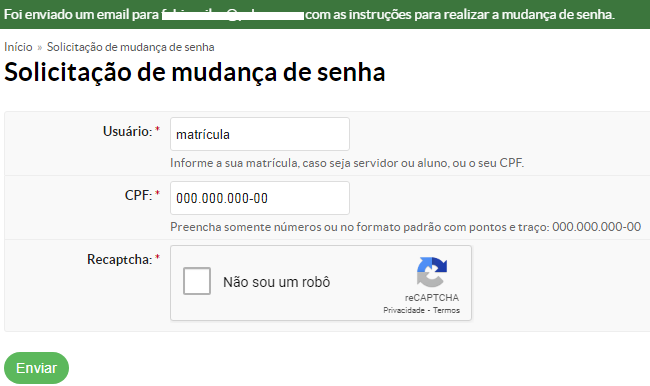 Após clicar no link Troca de senha, você será direcionado para a tela de Solicitação de mudança de senha. Nesta tela, informe sua matrícula e número do CPF, marque a opção "Não sou um robô" e clique no botão Enviar.