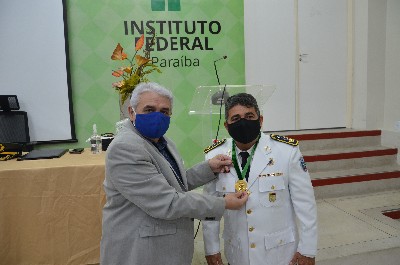Na sequência da solenidade, o Major da Polícia Militar da Paraíba, Luciano Adonias Barbosa, ex-aluno da Escola Técnica Federal da Paraíba, recebeu das mãos do Reitor Nicácio Lopes a Medalha do Mérito Coriolano de Medeiros. “Para mim é motivo de muito orgulho, muita honra, eu que já fui aluno da Escola Técnica Federal da Paraíba; que tive meu filho graduado aqui em Engenharia; eu que trago comigo todos esses anos o IFPB no meu coração. Esta homenagem eu vou guardar comigo para o resto da vida. Isso só aumenta ainda mais a minha responsabilidade. Eu só tenho a agradecer ao IFPB, pelo reconhecimento”, declarou o Major Luciano Barbosa.