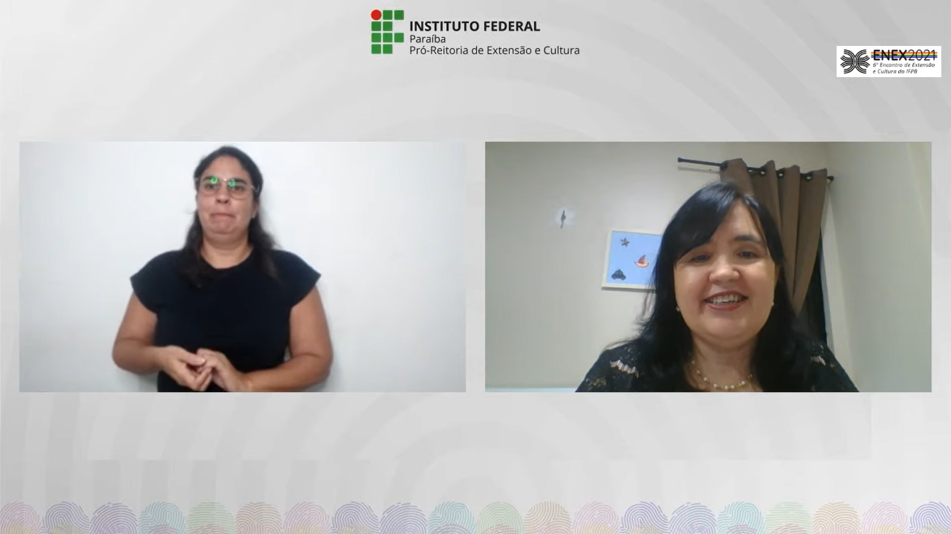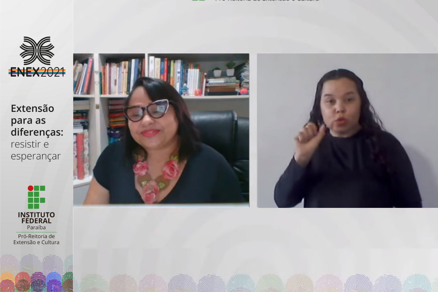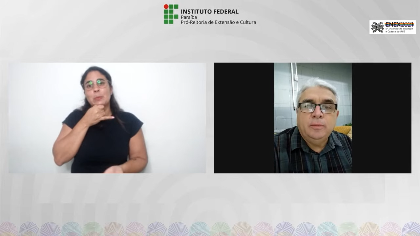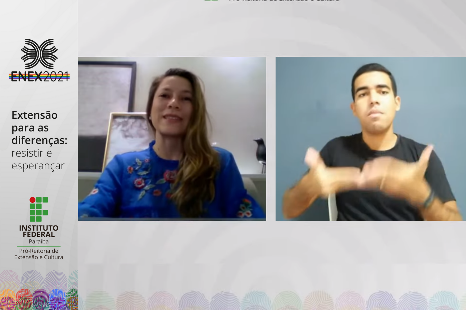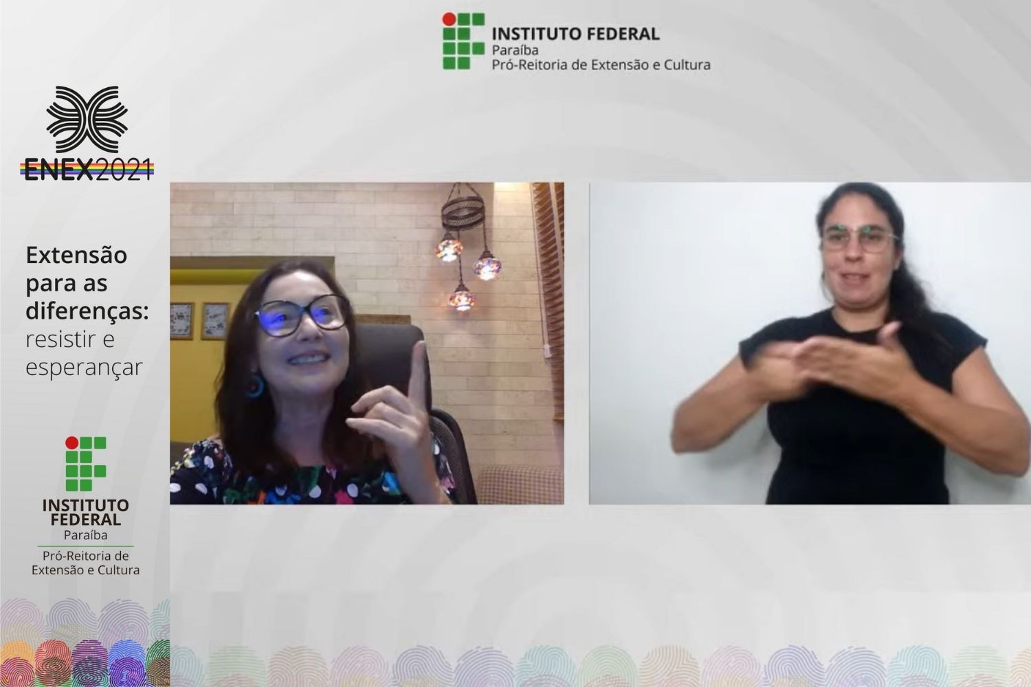 Este primeiro momento do Enex com a apresentação de Nathalia Bellar e apresentação da Mostras e da Feira, pode ser visto neste link. Todo o evento conta com autodescrição dos falantes e no período da tarde teve os intérpretes de Libras Edson Filho, do Campus Sousa, e Valdenuza, do Campus Monteiro.