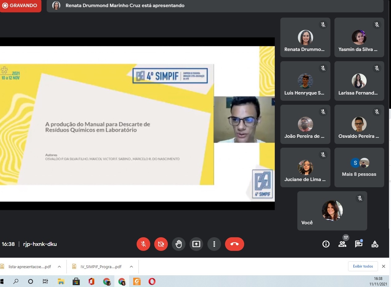 Na sessão técnica de iniciação científica, os alunos do terceiro ano do Curso Técnico em Química do IFPB, Campina Grande, Osvaldo Pereira da Silva Filho e, Maicol Victor Ferreira Sabino, orientados pelo professor Marcelo Rodrigues do Nascimento apresentaram o projeto: Caracterização e Quantificação dos Resíduos Gerados no Laboratório de Química Analítica do IFPB, Campus Campina Grande. O trabalho foi pensado inicialmente para identificar e medir a quantidade e o volume dos resíduos gerados no Laboratório de Análise Química do Campus Campina Grande e com essas informações, montar um Procedimento Operacional Padrão (POP), que é o documento que rege tanto o tratamento quanto o descarte de resíduos no Laboratório de Química Analítica e, dependendo do êxito do projeto, expandir os procedimentos para os demais laboratórios do Campus. Por causa da pandemia, algumas etapas do trabalho não puderam ser concretizadas, então os pesquisadores partiram para a parte pedagógica do projeto. Eles tomaram como base, um manual sobre o tratamento de resíduos laboratoriais, que já existia na Instituição, e o traduziram para uma linguagem mais acessível para ser utilizado por todos os alunos, desde o primeiro ano.