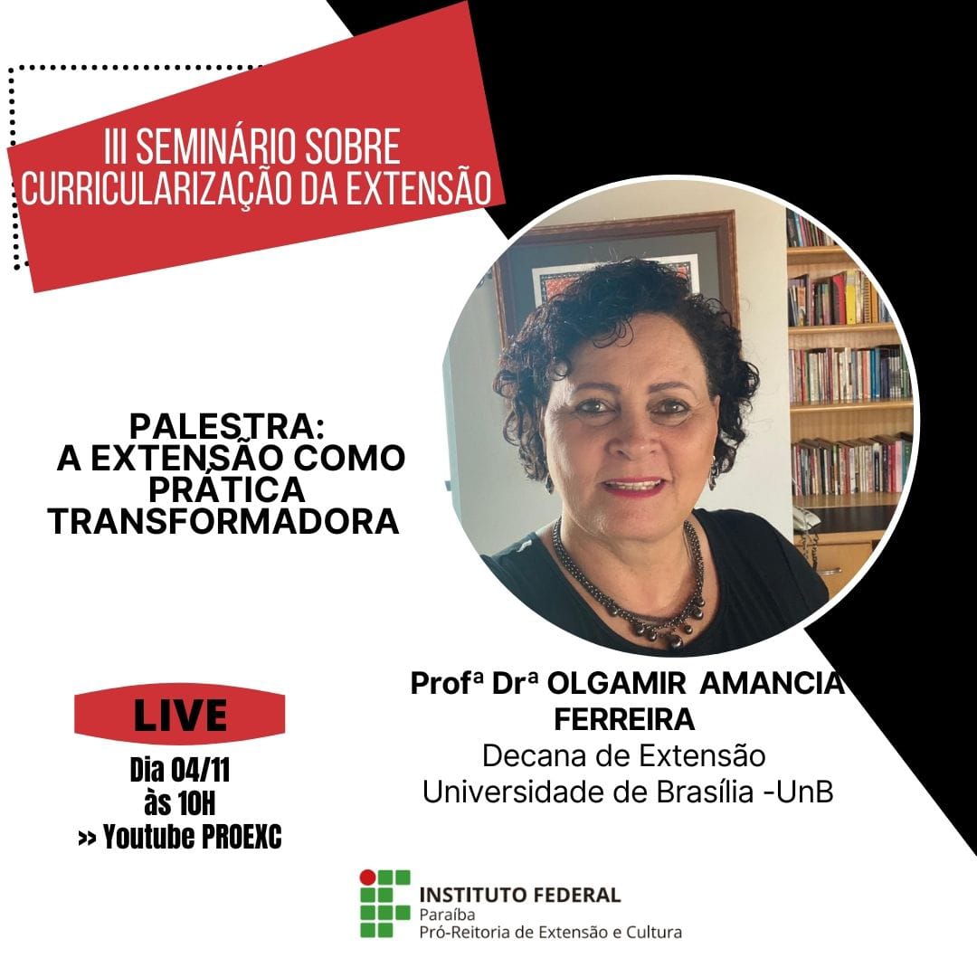 A palestra de abertura, no dia 04/11, irá debater "A Extensão como Prática Transformadora", com a Profª Drª Olgamir Amancia Ferreira - Decana de Extensão da Universidade de Brasília -UnB.