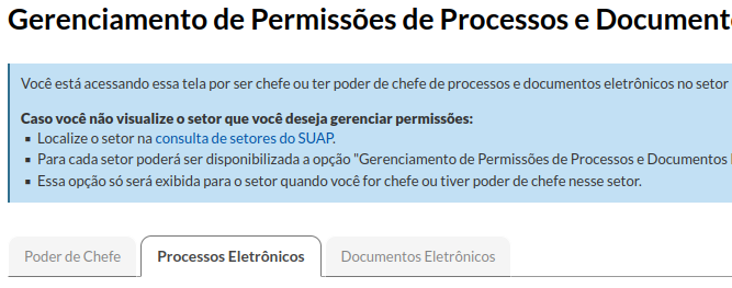 Para isso, o chefe/ocupante anterior precisa acessar a opção de menu no SUAP: ADMINISTRAÇÃO > Processo eletrônico > Gerenciamento de permissões, e lhe atribuir as devidas permissões.