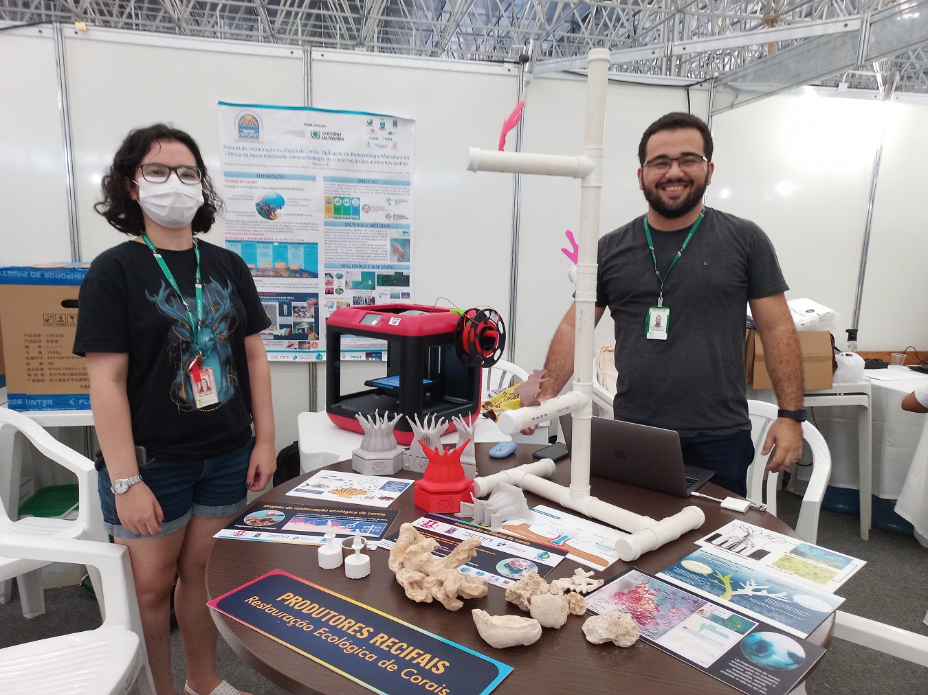A iniciativa envolve a aluna da graduação de Design de Interiores, Thaise Cavalcante, e o professor Ramon Medeiros, de Informática, ambos do campus João Pessoa, que atuam no Laboratório Lampião Maker de prototipagem. Segundo Ramon, a pesquisadora procurou o IFPB para que a instituição pudesse elaborar e imprimir artefatos em 3D que podem servir para a sua pesquisa de recuperação de corais marinhos. A equipe está na fase de validação de forma e material e no evento exibiu algumas peças e modelos já redesenhados. A pesquisadora pretende utilizar fragmentos de corais que estão passando pelo processo de branqueamento e deterioração para que possam ser enxertados em bioestruturas que funcionarão como os recifes. O IFPB está fazendo estas estruturas.