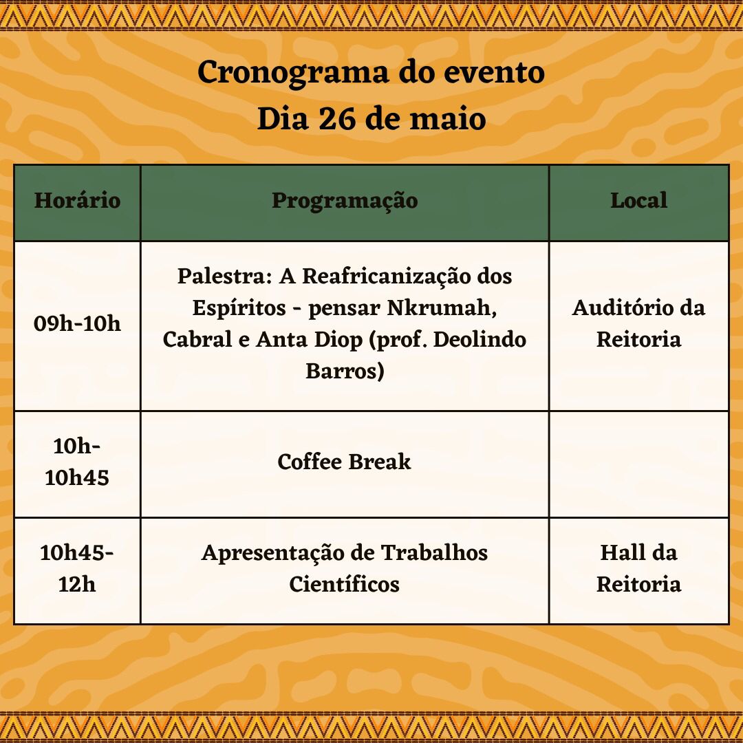 Este ano, o tema central do evento será “Consciência Afrocêntrica”. Na programação constam Feira Africana, Palestras, Mesas redondas, Cinema, Workshops, Apresentações de trabalhos científicos, Rodas de conversas, Momento desportivo e Desfile de moda. O evento é gratuito e aberto ao público, organizado pela Associação do Programa de Estudantes-Convênio de Graduação (APEC-G) e a Agência de Cooperação Internacional da Universidade Federal da Paraíba (ACI/UFPB) com o apoio do Instituto Federal da Paraíba (IFPB).