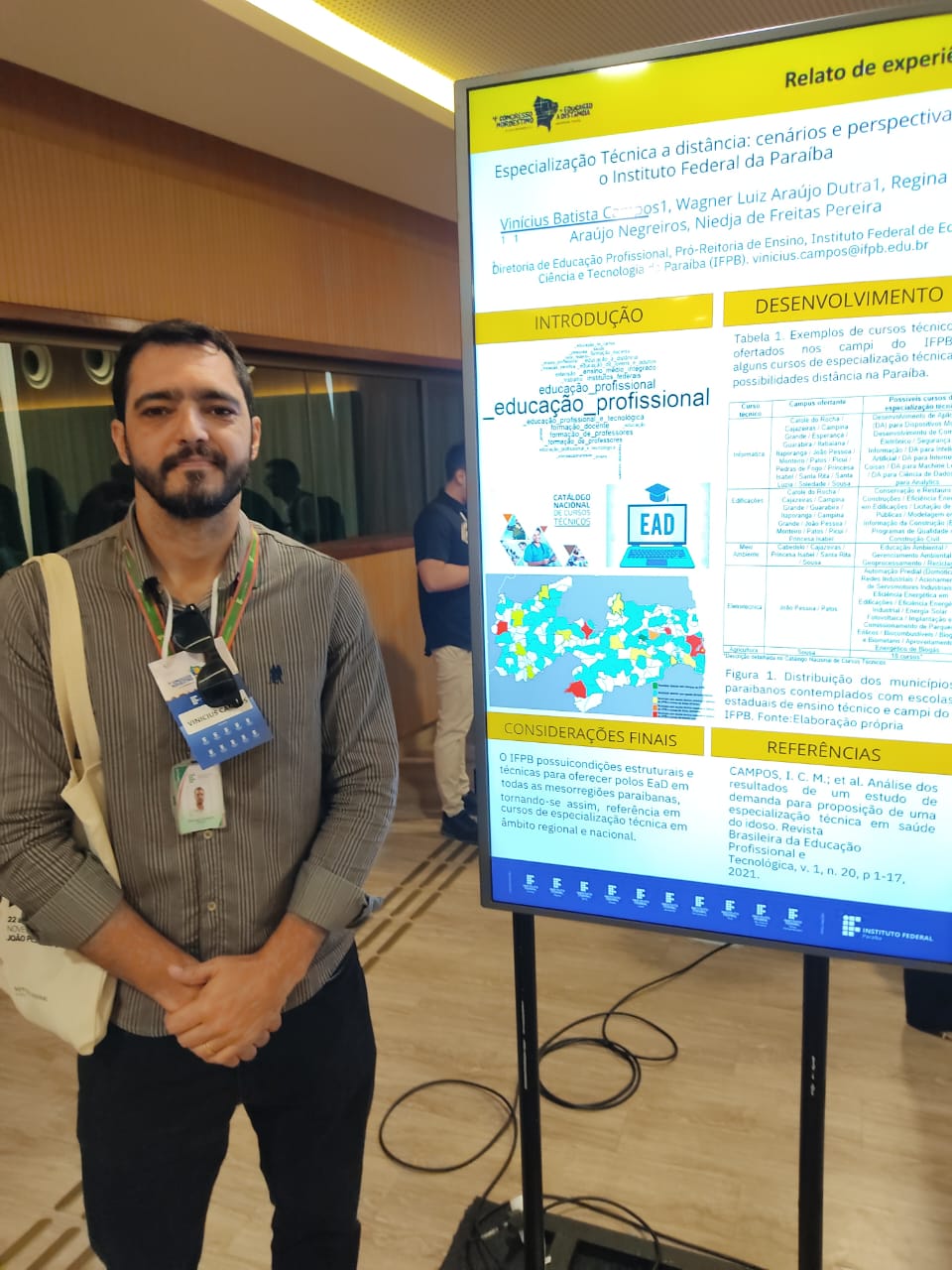 Quem circulou na manhã desta quinta-feira (23) pelo Centro de Eventos pôde ver a reflexão de temas importantes. No espaço dedicado ao relato de experiências o Diretor de Educação Profissional, professor Vinícius Batista, expôs uma avaliação das possibilidades de oferta de Especialização Técnica a distância no âmbito do IFPB. “Fizemos uma prospecção das áreas com base nos egressos oriundos do IFPB e das Escolas Técnicas estaduais na Paraíba. Com isso conseguimos detectar, por exemplo, na área de agricultura, 18 possibilidade de especializações técnicas que podem ser ofertadas.” disse.