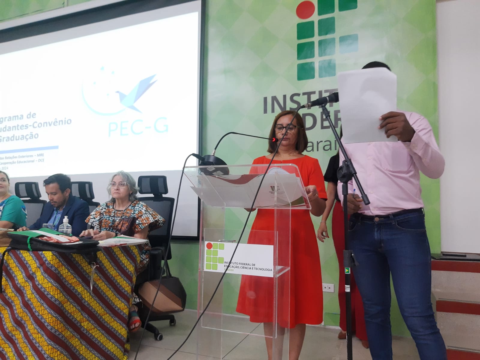 Ao falar para os estudantes, a reitora do IFPB, Mary Roberta Meira Marinho, destacou a importância da internacionalização do Instituto e ressaltou o bom relacionamento com o Ministério das Relações Exteriores (MRE), que enviou uma representante ao evento. A reitora ainda incentivou os novos alunos e alunas do PEC-G a buscarem ajuda dos profissionais do IFPB, caso necessário. “Não sejam tímidos em nos procurar. Estamos aqui como irmãos, mais do que educadores”, disse.