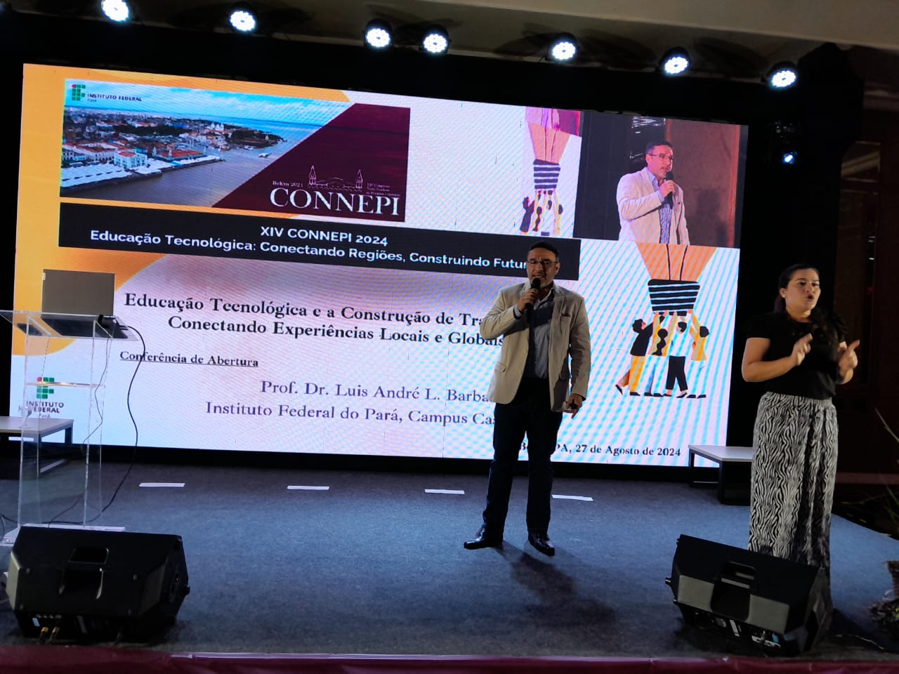 Com o título “Educação tecnológica e a construção de trajetórias: conectando experiências locais e globais” a palestra de abertura foi ministrada pelo Professor do campus Castanhal do Instituto Federal do Pará, Luís André Barbas. Entre outros aspectos, o docente falou das inovações tecnológicas que têm potencializado a inclusão social e a competitividade. O pesquisador compartilhou dados importantes relativos ao panorama da pesquisa no Brasil. “O nosso país ocupa a 13ª posição no mundo em produção de publicações científicas, demos um salto qualitativo nos últimos cinco anos e houve aumento de 10% na interação com outros pesquisadores internacionais nas publicações”. Professor André também falou do uso da Inteligência Artificial e disse que o Brasil está entre os 20 países em pesquisas sobre IA e alertou nos cuidados com a ética e segurança de dados.