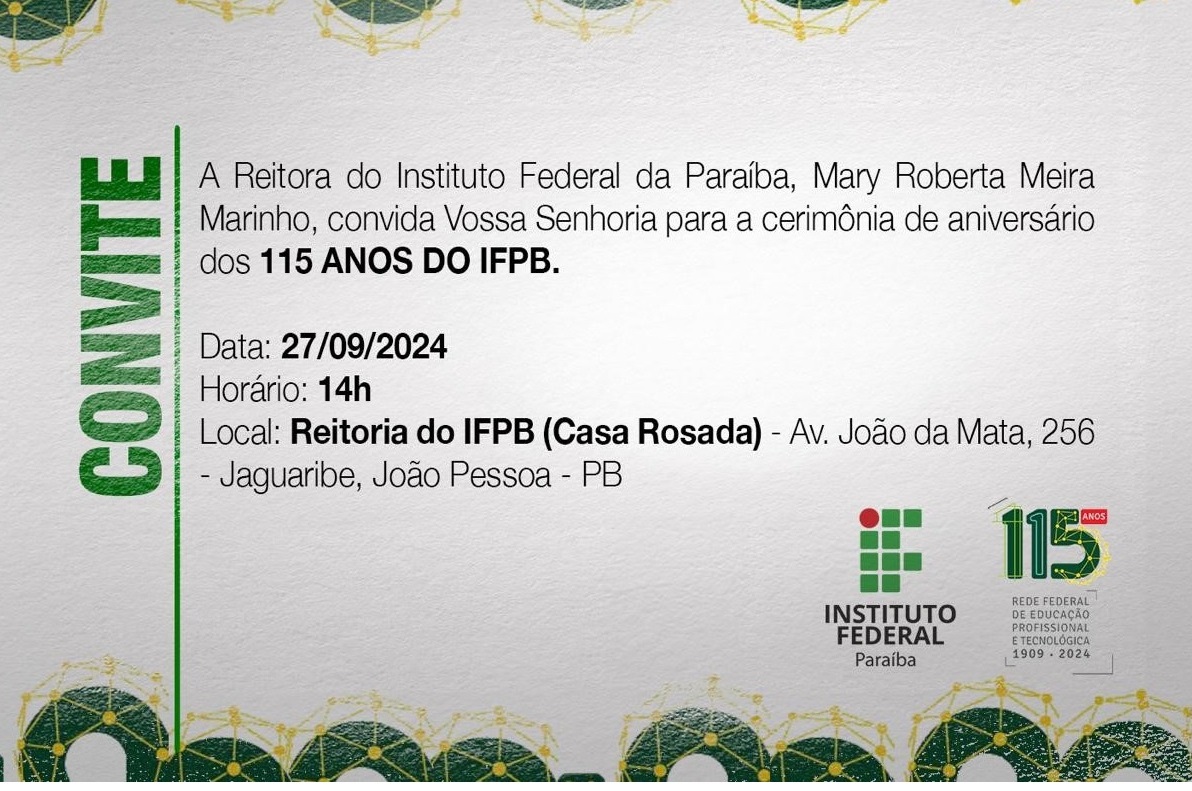 No Instituto Federal da Paraíba, a Reitoria vai promover uma comemoração na tarde da sexta-feira, 27 de setembro, com presença de representações de todos os seus 21 campi. Muita arte e um pouco da exposição do que há de melhor sendo produzido por nossos estudantes, servidores em exercício e aposentados.