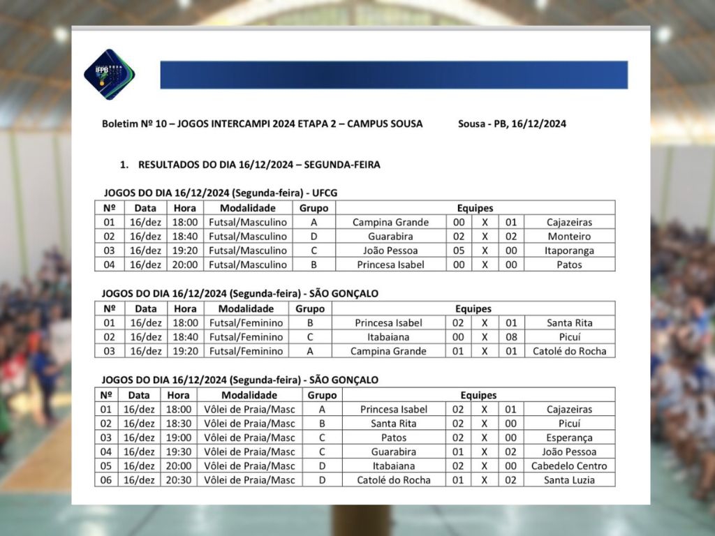 Pouco tempo depois do término da solenidade de abertura, as competições de futsal feminino e masculino foram iniciadas, sendo a primeira no próprio Campus Sousa e a segunda no campus parceiro da UFCG. A Unidade São Gonçalo também foi palco das primeiras disputadas do vôlei de praia masculino. As competições seguem nesta terça-feira (17), que vai receber, além dos esportes já iniciados, as disputas do vôlei de quadra feminino e masculino, handebol feminino e masculino, tênis de mesa e judô. Os jogos seguem até o dia 19.